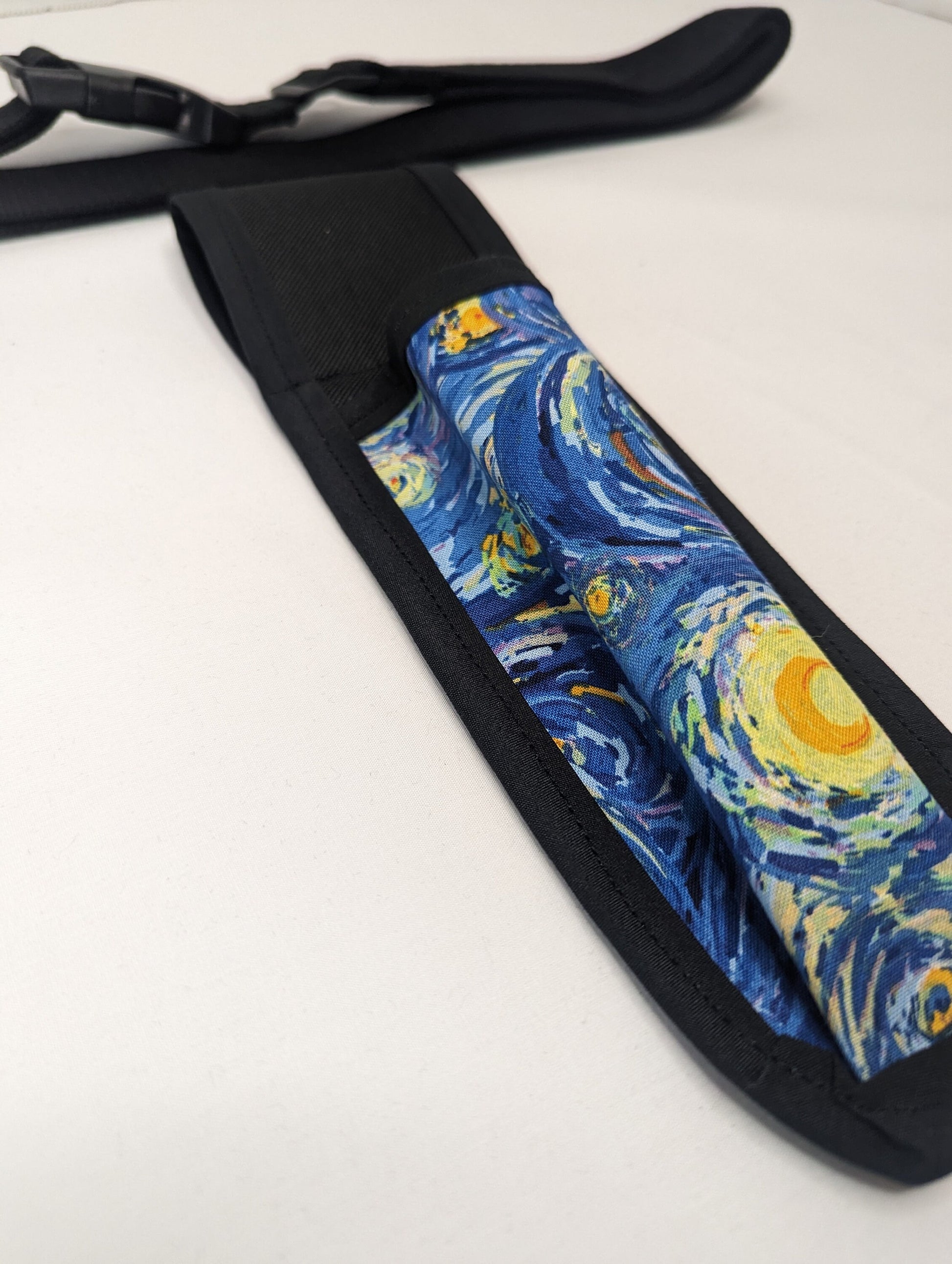 Showcase your style at work with a lotion holster that is also a statement piece! This single lotion holster holds a standard 8 oz lotion bottle and is made to last. This holster is made with black waterproof canvas throughout with quilting cotton fused to the pocket with double sided fusible interfacing to create a holster made for years of pump action, oil drips, and sliding from side to side.