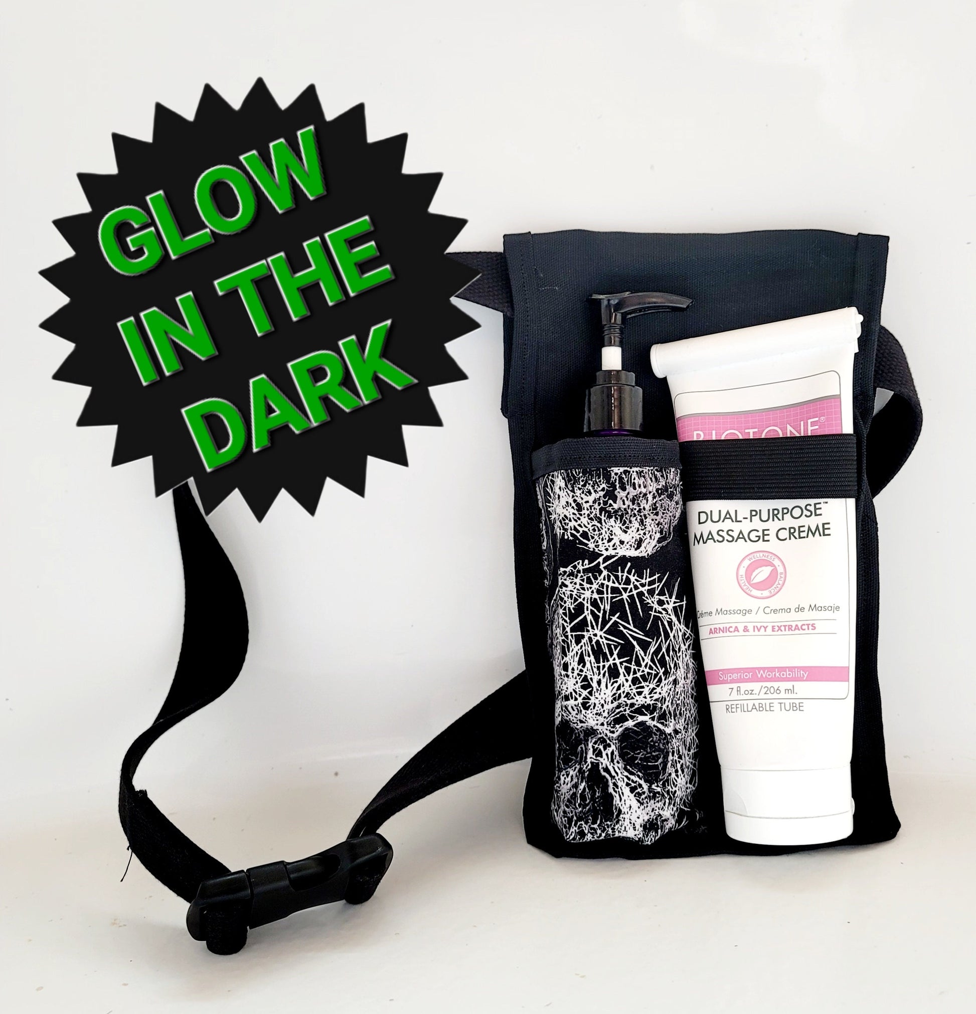 Showcase your style at work with a cream an lotion holster that is also a statement piece! This single lotion holster holds a standard 7 oz refillable cream tube and is made to last. This holster is made with black waterproof canvas throughout with quilting cotton fused to the pocket with double sided fusible interfacing to create a holster made for years drips, and sliding from side to side.