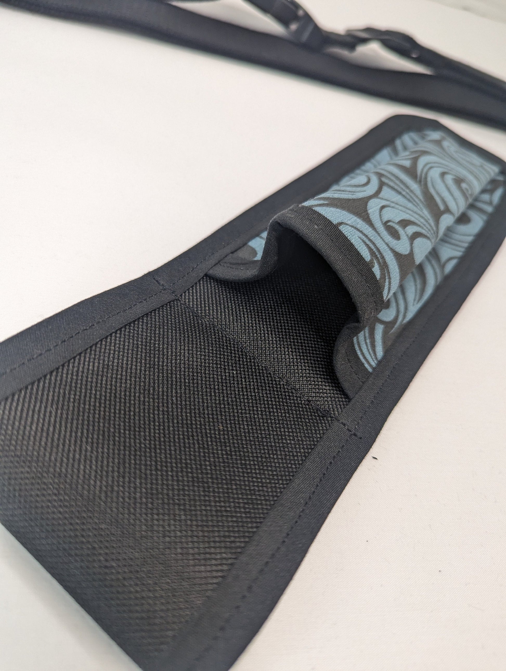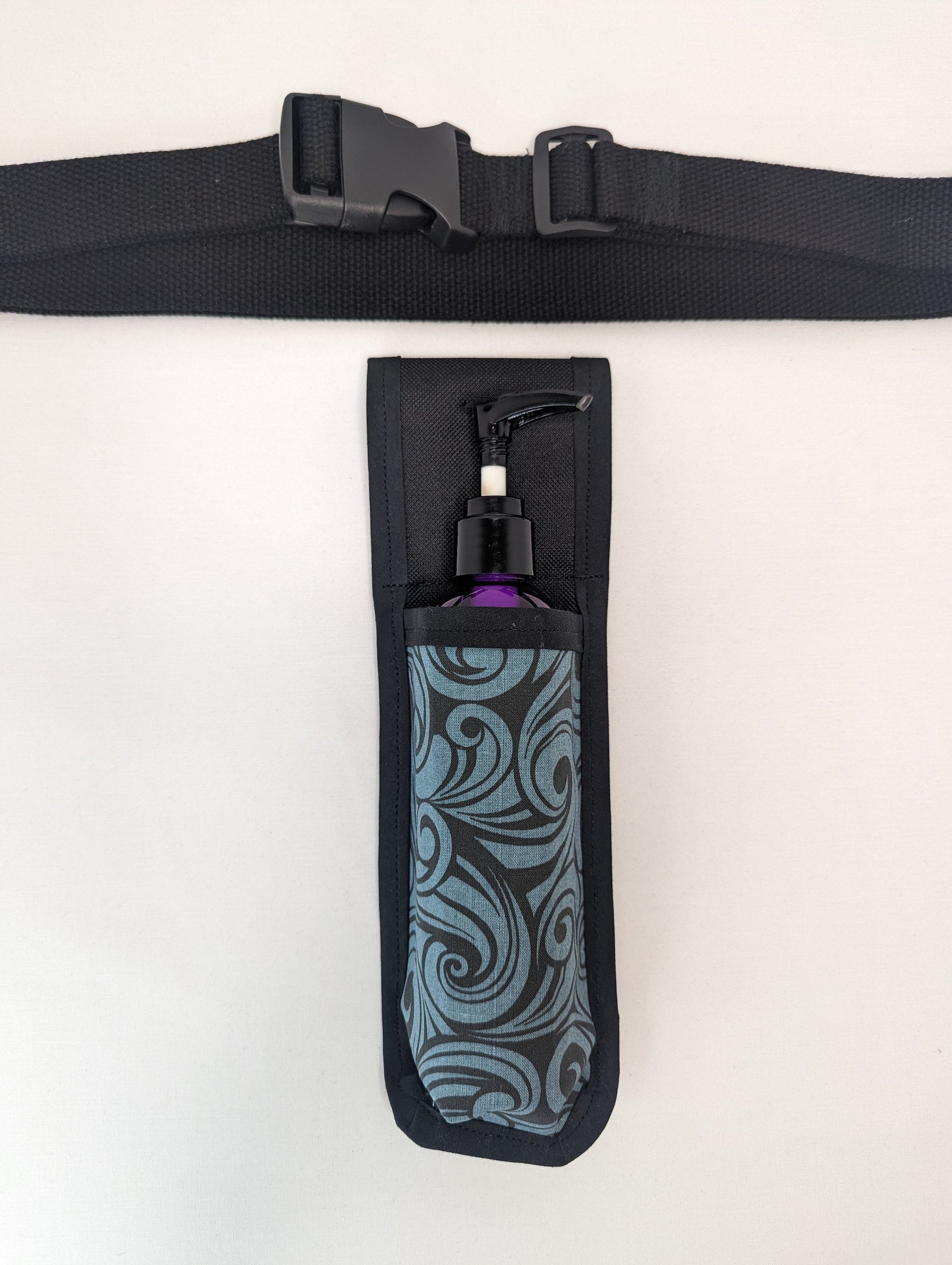 Showcase your style at work with a lotion holster that is also a statement piece! This single lotion holster holds a standard 8 oz lotion bottle and is made to last. This holster is made with black waterproof canvas throughout with quilting cotton fused to the pocket with double sided fusible interfacing to create a holster made for years of pump action, oil drips, and sliding from side to side.